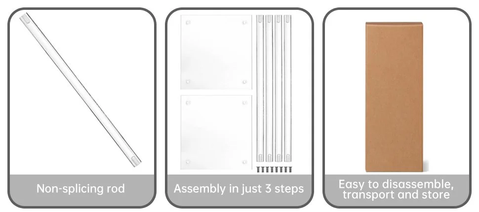 The main body and accessories of this acrylic candelabra candle holder are designed with threads for better installation, just screw the rod into the base and the lower end of the candle hole, then install the silver feet and lampshade to complete the installation, detachable design ensures safe transportation and saves space.